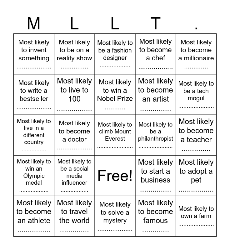 This bingo card has 26 words: Free!, Most likely to become famous ............., Most likely to win a Nobel Prize ..........., Most likely to travel the world .............., Most likely to become a millionaire ............., Most likely to invent something ..................., Most likely to write a bestseller ..................., Most likely to be on a reality show ..............., Most likely to become a teacher .............., Most likely to start a business ..............., Most likely to become an artist ..............., Most likely to live in a different country ..............., Most likely to adopt a pet ................., Most likely to become an athlete ................, Most likely to become a doctor ..................., Most likely to host a talk show .................., Most likely to become a chef .................., Most likely to win an Olympic medal .................., Most likely to be a fashion designer .................., Most likely to climb Mount Everest ......................, Most likely to be a tech mogul ....................., Most likely to solve a mystery ..................., Most likely to be a philanthropist ....................., Most likely to be a social media influencer ................., Most likely to live to 100 ................. and Most likely to own a farm ......................