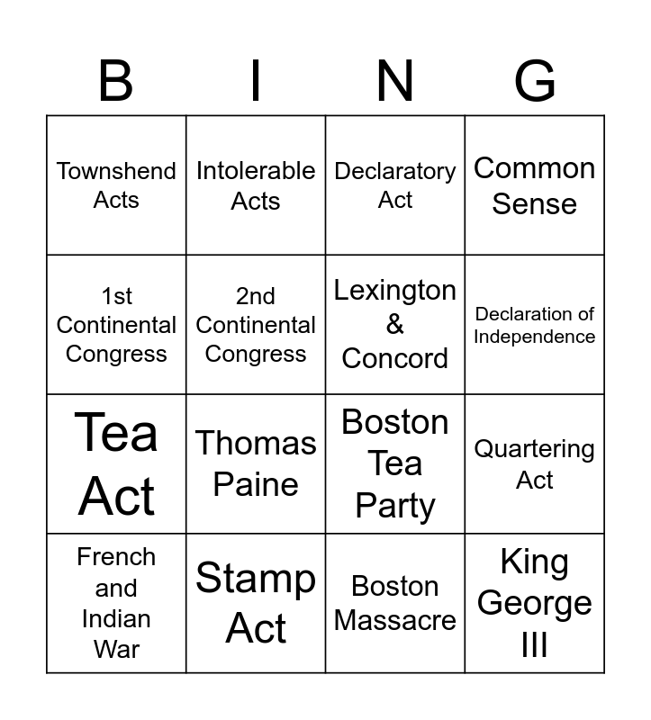 This bingo card has 16 words: Stamp Act, Quartering Act, Declaratory Act, Townshend Acts, Tea Act, Intolerable Acts, Boston Tea Party, Boston Massacre, 1st Continental Congress, 2nd Continental Congress, French and Indian War, Common Sense, Thomas Paine, Declaration of Independence, Lexington & Concord and King George III.