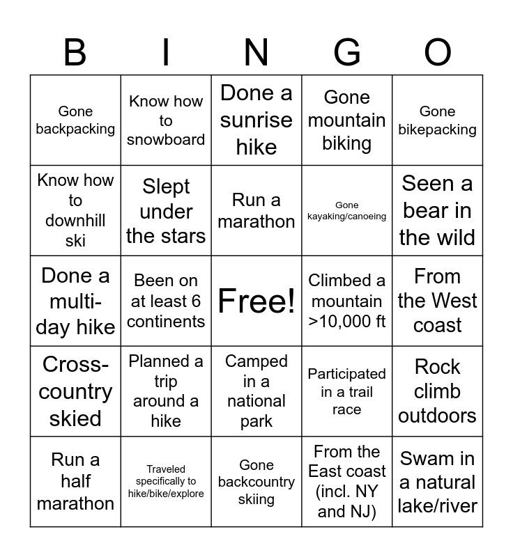 This bingo card has a free space and 24 words: Planned a trip around a hike, Traveled specifically to hike/bike/explore, Run a marathon, Run a half marathon, Gone bikepacking, Gone backpacking, Know how to downhill ski, Know how to snowboard, Climbed a mountain >10,000 ft, Camped in a national park, Gone kayaking/canoeing, Done a multi-day hike, Participated in a trail race, Rock climb outdoors, Slept under the stars, From the East coast (incl. NY and NJ), From the West coast, Done a sunrise hike, Seen a bear in the wild, Been on at least 6 continents, Swam in a natural lake/river, Cross-country skied, Gone mountain biking and Gone backcountry skiing.