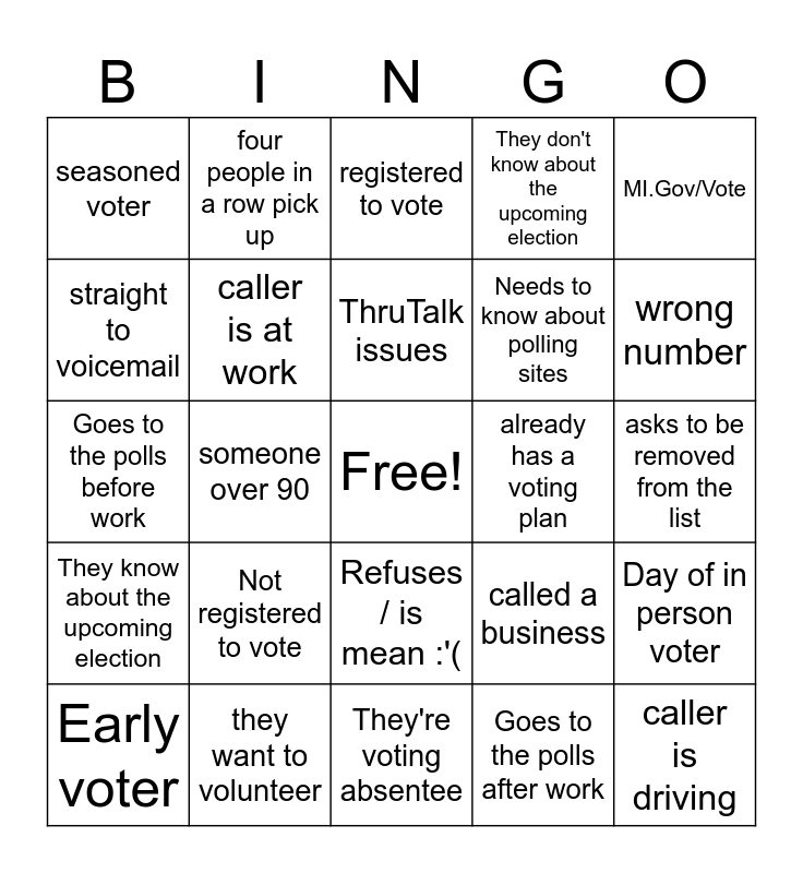 This bingo card has a free space and 24 words: Early voter, Not registered to vote, ThruTalk issues, Goes to the polls after work, MI.Gov/Vote, seasoned voter, four people in a row pick up, registered to vote, already has a voting plan, asks to be removed from the list, Goes to the polls before work, caller is at work, called a business, Day of in person voter, straight to voicemail, they want to volunteer, They're voting absentee, They don't know about the upcoming election, wrong number, They know about the upcoming election, someone over 90, Refuses / is mean :'(, Needs to know about polling sites and caller is driving.