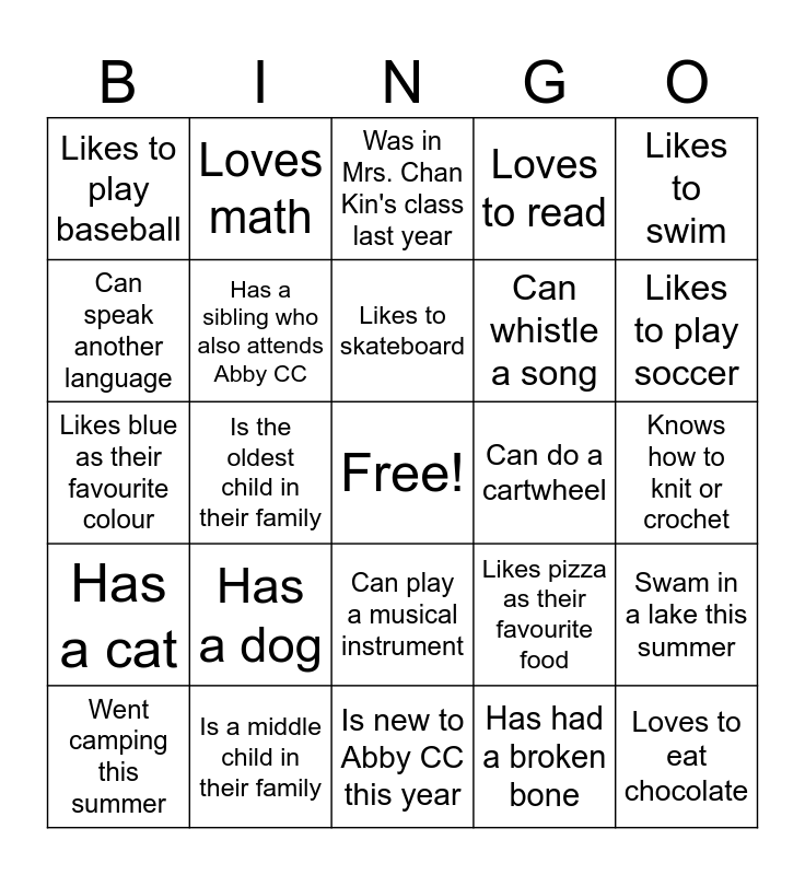 This bingo card has a free space and 29 words: Went camping this summer, Went to Vancouver Island in the summer, Is the oldest child in their family, Has taken a dance class, Likes to play baseball, Was in Mrs. Chan Kin's class last year, Has a sibling who also attends Abby CC, Has a dog, Can do a cartwheel, Is a middle child in their family, Knows how to knit or crochet, Loves to eat chocolate, Is new to Abby CC this year, Has had a broken bone, Likes to play soccer, Is the youngest child in their family, Can play a musical instrument, Has a cat, Likes to swim, Likes blue as their favourite colour, Likes pizza as their favourite food, Likes to ride their bike, Can whistle a song, Can speak another language, Loves to read, Loves math, Swam in a lake this summer, Likes to skateboard and Has more than 2 siblings.