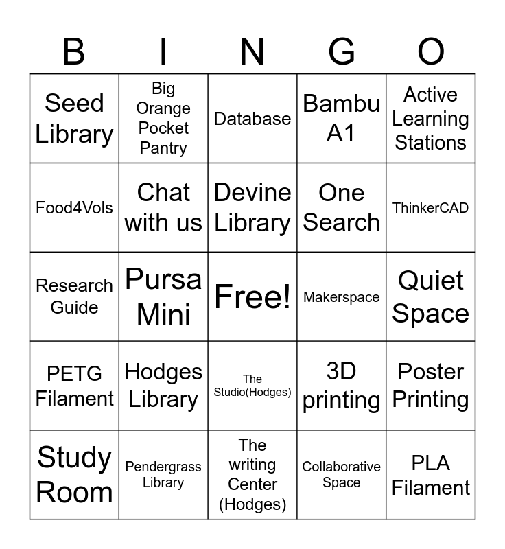 This bingo card has a free space and 24 words: Hodges Library, Pendergrass Library, Devine Library, Study Room, Active Learning Stations, Seed Library, Food4Vols, Big Orange Pocket Pantry, Makerspace, The Studio(Hodges), One Search, Research Guide, 3D printing, Poster Printing, Chat with us, Collaborative Space, Quiet Space, Database, ThinkerCAD, Pursa Mini, PLA Filament, PETG Filament, Bambu A1 and The writing Center (Hodges).