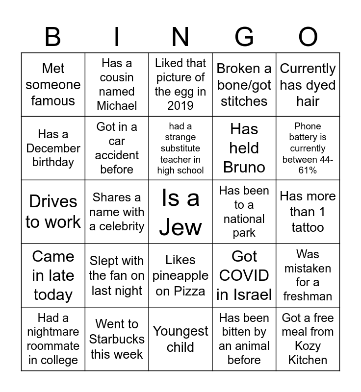 This bingo card has a free space and 24 words: Slept with the fan on last night, Went to Starbucks this week, had a strange substitute teacher in high school, Had a nightmare roommate in college, Currently has dyed hair, Met someone famous, Has a December birthday, Has a cousin named Michael, Has been to a national park, Likes pineapple on Pizza, Has held Bruno, Drives to work, Got COVID in Israel, Was mistaken for a freshman, Got in a car accident before, Has been bitten by an animal before, Has more than 1 tattoo, Liked that picture of the egg in 2019, Phone battery is currently between 44-61%, Shares a name with a celebrity, Got a free meal from Kozy Kitchen, Came in late today, Broken a bone/got stitches and Youngest child.