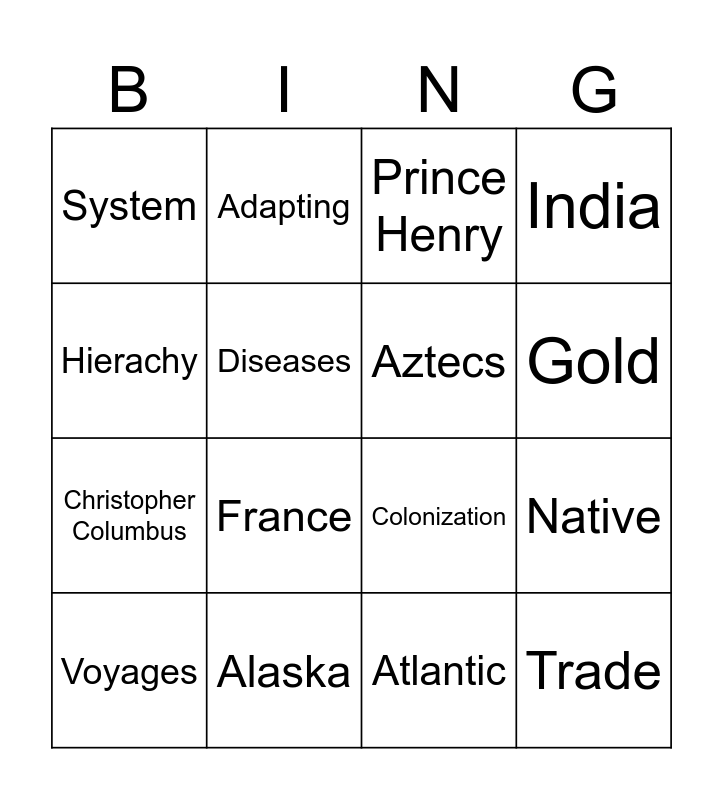 This bingo card has 16 words: Alaska, Native, Prince Henry, System, Christopher Columbus, Adapting, Colonization, Atlantic, Hierachy, Diseases, Voyages, India, France, Gold, Aztecs and Trade.