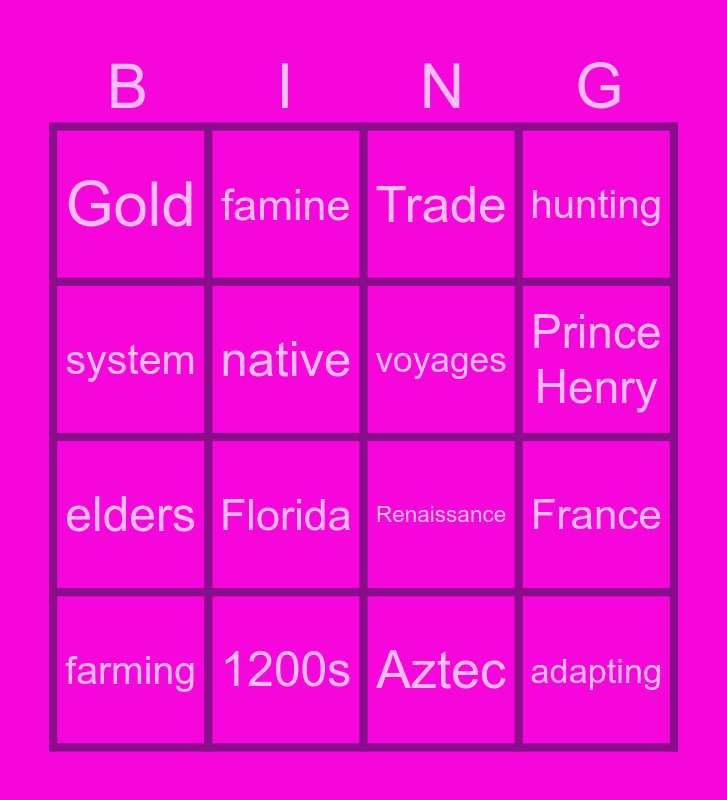This bingo card has 16 words: 1200s, France, Trade, Gold, elders, famine, Renaissance, Aztec, system, native, farming, hunting, Florida, Prince Henry, voyages and adapting.