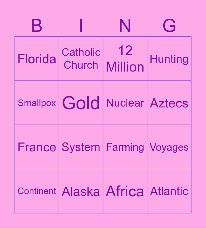 This bingo card has 16 words: Alaska, Voyages, 12 Million, Florida, France, Catholic Church, Farming, Africa, Smallpox, Gold, Continent, Hunting, System, Aztecs, Nuclear and Atlantic.