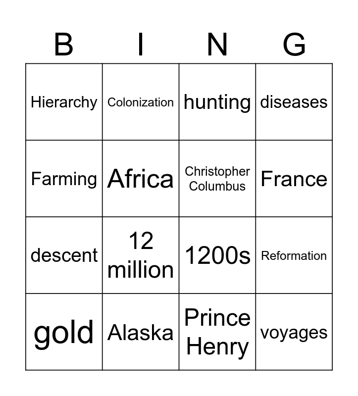 This bingo card has 16 words: Alaska, Reformation, hunting, Hierarchy, descent, Colonization, 1200s, Prince Henry, Farming, Africa, gold, diseases, 12 million, France, Christopher Columbus and voyages.