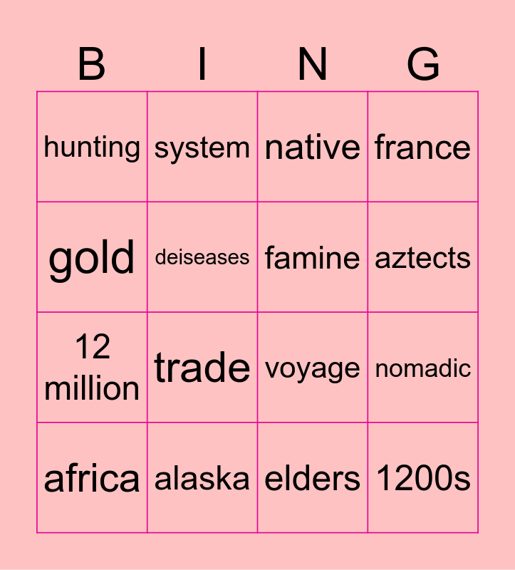 This bingo card has 16 words: alaska, nomadic, native, hunting, 12 million, system, voyage, elders, gold, deiseases, africa, france, trade, aztects, famine and 1200s.