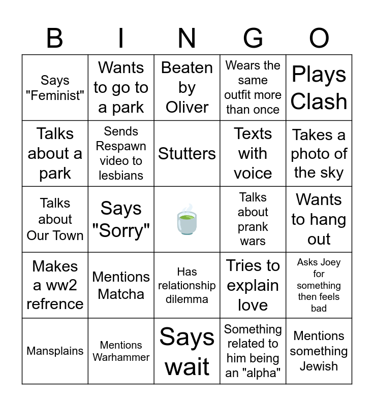 This bingo card has a free space and 24 words: Mentions Matcha, Mentions Warhammer, Stutters, Mansplains, Plays Clash, Says "Feminist", Talks about a park, Wants to go to a park, Talks about prank wars, Has relationship dilemma, Texts with voice, Talks about Our Town, Tries to explain love, Asks Joey for something then feels bad, Sends Respawn video to lesbians, Something related to him being an "alpha", Wants to hang out, Beaten by Oliver, Takes a photo of the sky, Says "Sorry", Mentions something Jewish, Makes a ww2 refrence, Wears the same outfit more than once and Says wait.