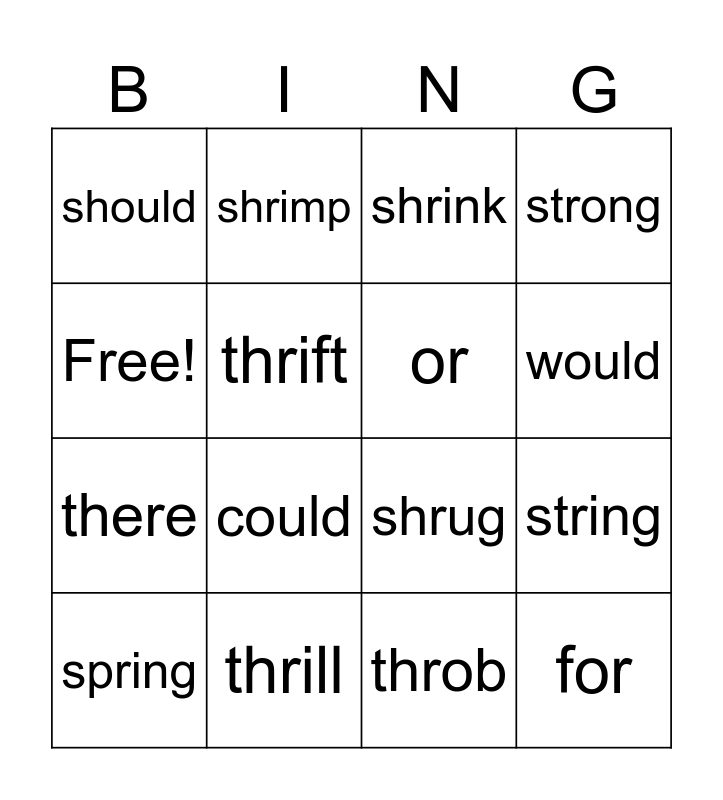 This bingo card has 16 words: thrill, string, shrink, should, there, shrimp, shrug, throb, Free!, thrift, spring, strong, could, would, or and for.