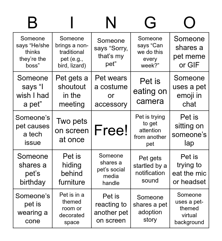 This bingo card has a free space and 75 words: Pet appears on camera, Pet meows/barks during the call, Someone says “Sorry, that’s my pet”, Pet walks across the keyboard, Someone shares a pet photo in chat, Pet gets picked up and shown to the camera, Someone’s pet is sleeping in the background, Pet interrupts a serious moment, Someone’s pet has a funny name, Pet tries to eat something on camera, Free Space: Pet love!, Someone shares a pet story, Pet wears a costume or accessory, Someone says “I wish I had a pet”, Pet gets a virtual belly rub, Two pets on screen at once, Someone’s pet makes a surprise appearance, Someone uses a pet-themed virtual background, Pet gets a compliment from a coworker, Someone shares a pet meme or GIF, Pet joins a breakout room, Someone’s pet causes a tech issue, Pet gets a shoutout in the meeting, Someone brings a non-traditional pet (e.g., bird, lizard), Someone says “Can we do this every week?”, Pet stares directly into the camera, Someone’s pet is louder than the person speaking, Pet tries to climb on their human, Someone apologizes for their pet’s behavior, Pet appears in a breakout room, Someone shares a pet pun, Pet is completely uninterested in the meeting, Someone’s pet is in a carrier or crate, Pet gets startled by a notification sound, Someone uses a pet emoji in chat, Pet is eating on camera, Someone’s pet is wearing a bowtie or bandana, Someone says “He/she just wants attention”, Pet is sitting on someone’s lap, Someone shares a pet adoption story, Pet is blocking the webcam, Someone’s pet is snoring, Pet is licking the screen or camera, Someone’s pet is perched on furniture, Someone shares a pet fail story, Pet is playing with a toy in the background, Someone’s pet is wearing a cone, Someone says “He/she thinks they’re the boss”, Pet is in a blanket or bed, Someone’s pet is a rescue, Pet is trying to get outside, Someone shares a pet’s social media handle, Pet is chewing something they shouldn’t, Someone’s pet is a senior, Someone’s pet is a baby/puppy/kitten, Pet is sitting on a windowsill, Someone’s pet is a foster, Pet is wearing a hat, Someone’s pet is a breed you’ve never heard of, Someone shares a pet-themed mug or shirt, Pet is hiding behind furniture, Someone’s pet is named after a celebrity or character, Someone says “He/she loves Zoom”, Pet is trying to get into a bag or box, Someone’s pet is a bonded pair, Pet is trying to get attention from another pet, Someone shares a pet’s favorite toy, Pet is in a stroller or backpack, Someone’s pet is a therapy or service animal, Pet is trying to eat the mic or headset, Someone shares a pet’s birthday, Pet is in a themed room or decorated space, Someone’s pet is featured in their profile picture, Pet is reacting to another pet on screen and Someone says “This is the best meeting ever”.