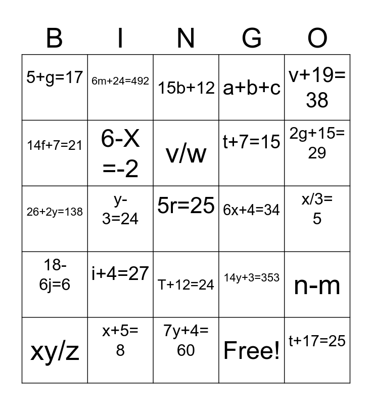 This bingo card has 30 words: x+5= 8, 2x=18, y-3=24, 2x+5=21, 5+g=17, 15b+12, 6-X =-2, T+12=24, 6x+4=34, 7y+4= 60, x/3= 5, 5r=25, Free!, t+17=25, 2g+15= 29, n +9= 18, 14y+3=353, 18-6j=6, i+4=27, v+19= 38, 26+2y=138, 2t+4= 50, 6m+24=492, t+7=15, 14f+7=21, a+b+c, n-m, xy/z, v/w and gh.