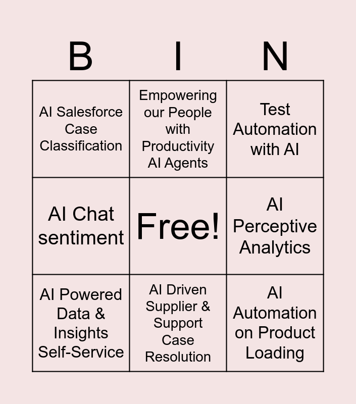 This bingo card has a free space and 11 words: Air Ticketing Fulfilment AI Automation, AI Driven Supplier & Support Case Resolution, AI Automation on Product Loading, AI Powered Data & Insights Self-Service, Empowering our People with Productivity AI Agents, Test Automation with AI, AI Perceptive Analytics, AI Agents for Live Support Chats, AI Chat sentiment, AI Salesforce Case Classification and Supply Machine Learning Forecast.