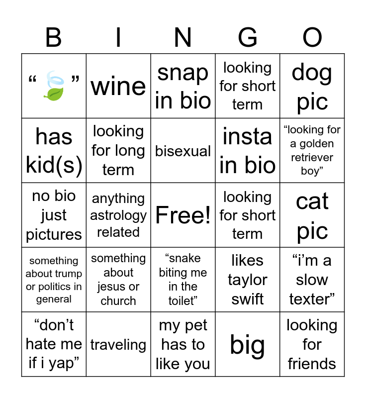 This bingo card has a free space and 24 words: something about jesus or church, traveling, bisexual, “don’t hate me if i yap”, dog pic, “🍃”, has kid(s), wine, looking for short term, “snake biting me in the toilet”, insta in bio, no bio just pictures, likes taylor swift, “i’m a slow texter”, looking for long term, big, cat pic, snap in bio, “looking for a golden retriever boy”, anything astrology related, looking for friends, something about trump or politics in general, looking for short term and my pet has to like you.