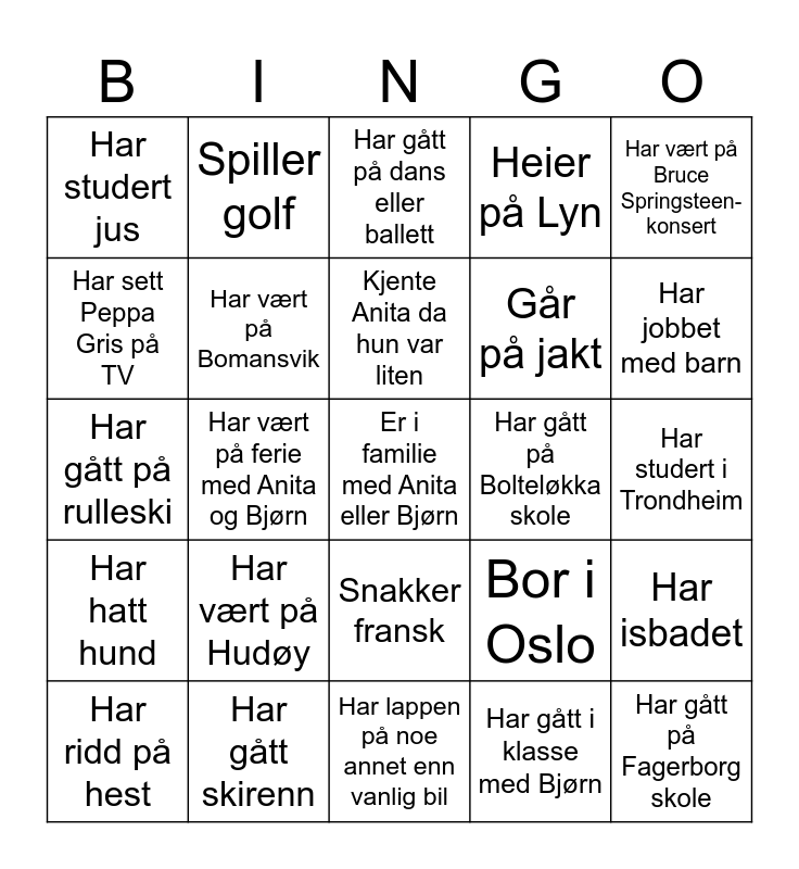 This bingo card has 40 words: Har bodd på Bislett, Har gått på rulleski, Kan spille et instrument, Har vært på Bomansvik, Har gått skirenn, Snakker fransk, Kjente Anita da hun var liten, Har deltatt i noe med startnummer på brystet, Har vært på Bruce Springsteen-konsert, Har hatt hund, Har vært på ferie med Anita og Bjørn, Heier på Lyn, Er i familie med Anita eller Bjørn, Har studert i Trondheim, Har gått på Bolteløkka skole, Har vært på Hudøy, Er pensjonist, Har studert jus, Har spilt i korps, Har gått på dans eller ballett, Har isbadet, Har gått i klasse med Bjørn, Går på jakt, Har sett Peppa Gris på TV, Har studert realfag, Har deltatt i Norway Cup, Bor på Sørlandet, Har vært på Galdhøpiggen, Har gått på Fagerborg skole, Har vært i dyreparken i Kristiansand, Går på skole eller i barnehage, Har ridd på hest, Bor i Vestfold, Bor i Oslo, Har jobbet med barn, Har lappen på noe annet enn vanlig bil, Har søsken, Har vært i Portugal, Spiller golf and Har katt.