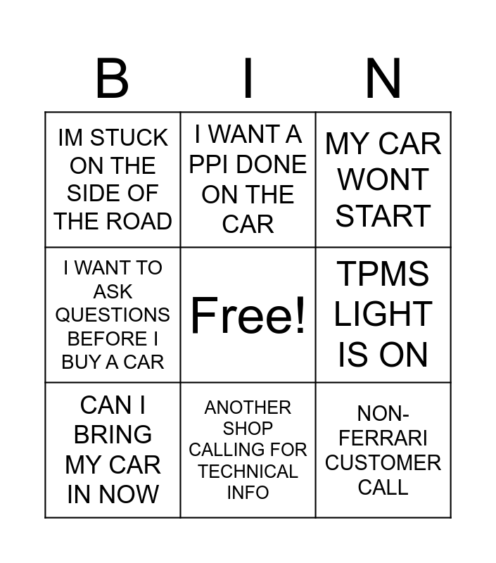 This bingo card has a free space and 8 words: TPMS LIGHT IS ON, MY CAR WONT START, I WANT A PPI DONE ON THE CAR, CAN I BRING MY CAR IN NOW, IM STUCK ON THE SIDE OF THE ROAD, NON-FERRARI CUSTOMER CALL, I WANT TO ASK QUESTIONS BEFORE I BUY A CAR and ANOTHER SHOP CALLING FOR TECHNICAL INFO.