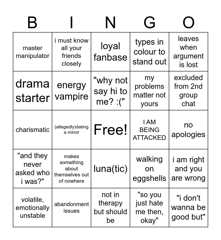 This bingo card has a free space and 24 words: makes something about themselves out of nowhere, abandonment issues, "why not say hi to me? :(", volatile, emotionally unstable, leaves when argument is lost, master manipulator, drama starter, i must know all your friends closely, I AM BEING ATTACKED, luna(tic), my problems matter not yours, charismatic, walking on eggshells, i am right and you are wrong, energy vampire, "so you just hate me then, okay", no apologies, loyal fanbase, excluded from 2nd group chat, (allegedly)dating a minor, "i don't wanna be good but", "and they never asked who i was?", types in colour to stand out and not in therapy but should be.