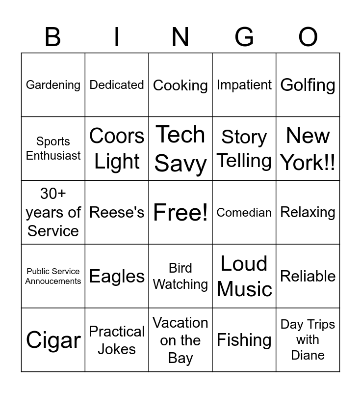 This bingo card has a free space and 29 words: Cigar, Phillies, Reese's, Heath Bars, Gardening, Cooking, Coors Light, Eagles, Comedian, Practical Jokes, Relaxing, Day Trips with Diane, Vacation on the Bay, Fishing, New York!!, Squirrel Feeding, Bird Watching, Public Service Annoucements, Golfing, 30+ years of Service, Loud Music, Traveling, Story Telling, Sports Enthusiast, Impatient, Dedicated, Reliable, Tech Savy and Toss the Alarm.