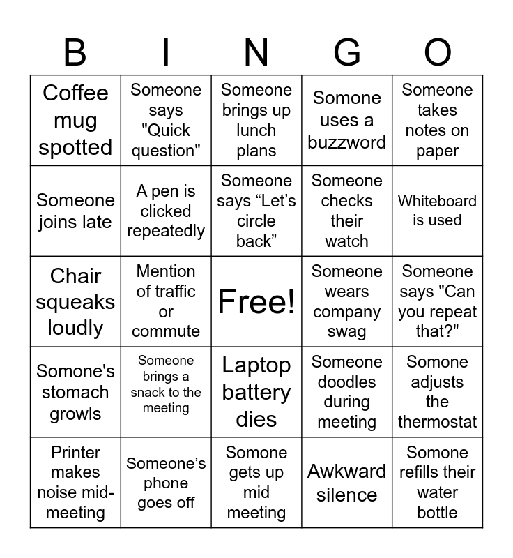 This bingo card has a free space and 24 words: Someone brings a snack to the meeting, Someone’s phone goes off, Someone says “Let’s circle back”, Printer makes noise mid-meeting, Someone takes notes on paper, Coffee mug spotted, Someone joins late, Someone says "Quick question", Someone wears company swag, Laptop battery dies, Someone checks their watch, Chair squeaks loudly, Someone doodles during meeting, Somone adjusts the thermostat, A pen is clicked repeatedly, Awkward silence, Someone says "Can you repeat that?", Someone brings up lunch plans, Whiteboard is used, Mention of traffic or commute, Somone refills their water bottle, Somone's stomach growls, Somone uses a buzzword and Somone gets up mid meeting.