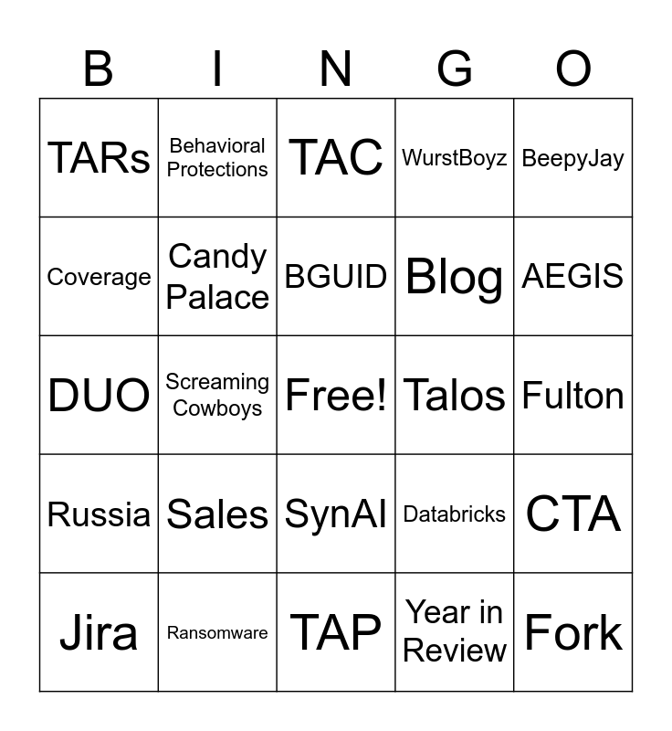 This bingo card has a free space and 48 words: Synapse, Fork, Merge, TAP, Sales, Cisco Secure Endpoint, Behavioral Protections, ClamAV, Coverage, Context, Candy Palace, WurstBoyz, CTA, Databricks, Clank, Surround, BGUID, Talos, Mummyman, BeepyJay, Screaming Cowboys, Year in Review, TARs, Blog, CTIB, AEGIS, Jira, Confluence, SynAI, Russia, Iran, DPRK, China, AOR, Ransomware, Pre-Ransomware, Austin, Fulton, GTADS, XDR, Ballpark Metrics, Roadmap, TAC, Hunting, DUO, DDW, IOD and IR.