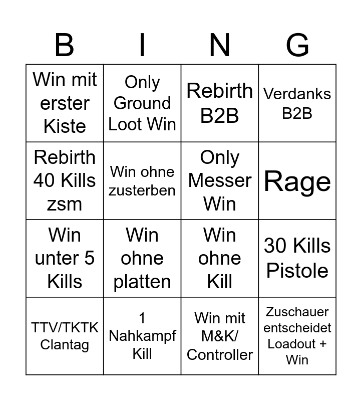 This bingo card has 16 words: TTV/TKTK Clantag, 1 Nahkampf Kill, Rebirth B2B, Verdanks B2B, Rebirth 40 Kills zsm, Only Ground Loot Win, Win ohne Kill, 30 Kills Pistole, Win mit erster Kiste, Win ohne zusterben, Win mit M&K/ Controller, Rage, Win unter 5 Kills, Win ohne platten, Only Messer Win and Zuschauer entscheidet Loadout + Win.