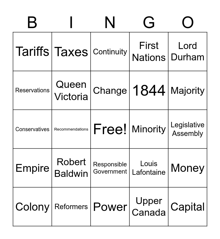 This bingo card has a free space and 34 words: The Act of Union, Upper Canada, Lower Canada, Constitution, Empire, Queen Victoria, Lord Durham, Colony, Taxes, Province of Canada, Change, Continuity, Free Trade, Governor, Minority, Majority, Reformers, Conservatives, Robert Baldwin, Louis Lafontaine, Responsible Government, Protectionism, Tariffs, Legislative Assembly, Power, Capital, First Nations, Bagot Commission, 1844, Reservations, Territory, Recommendations, Money and Trade.