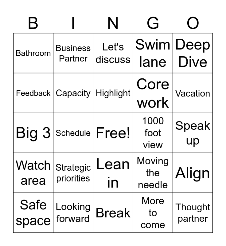 This bingo card has a free space and 32 words: More to come, Circle back, Schedule, Standard, Watch area, Capacity, Deep Dive, Align, Business Partner, Move things forward, Highlight, Let's discuss, Offline, Collaborate, 1000 foot view, Hollistic, Safe space, Big 3, Lean in, Strategic priorities, Moving the needle, Path forward, Speak up, Looking forward, Thought partner, Swim lane, Core work, Feedback, Bathroom, Break, Dollywood and Vacation.