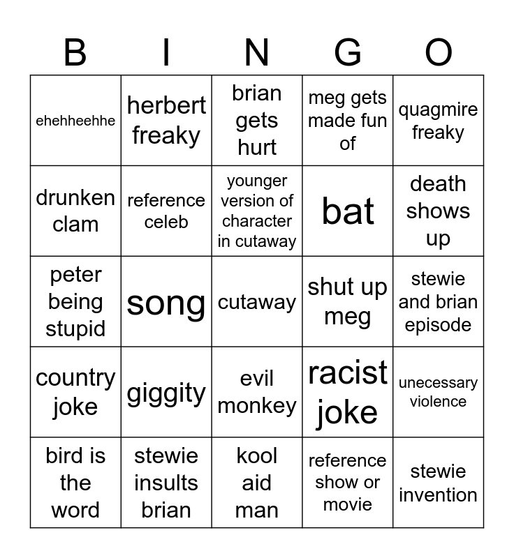 This bingo card has a free space and 24 words: giggity, stewie insults brian, younger version of character in cutaway, bird is the word, quagmire freaky, ehehheehhe, drunken clam, herbert freaky, shut up meg, evil monkey, bat, peter being stupid, racist joke, unecessary violence, reference celeb, reference show or movie, stewie and brian episode, brian gets hurt, death shows up, song, stewie invention, country joke, meg gets made fun of and kool aid man.