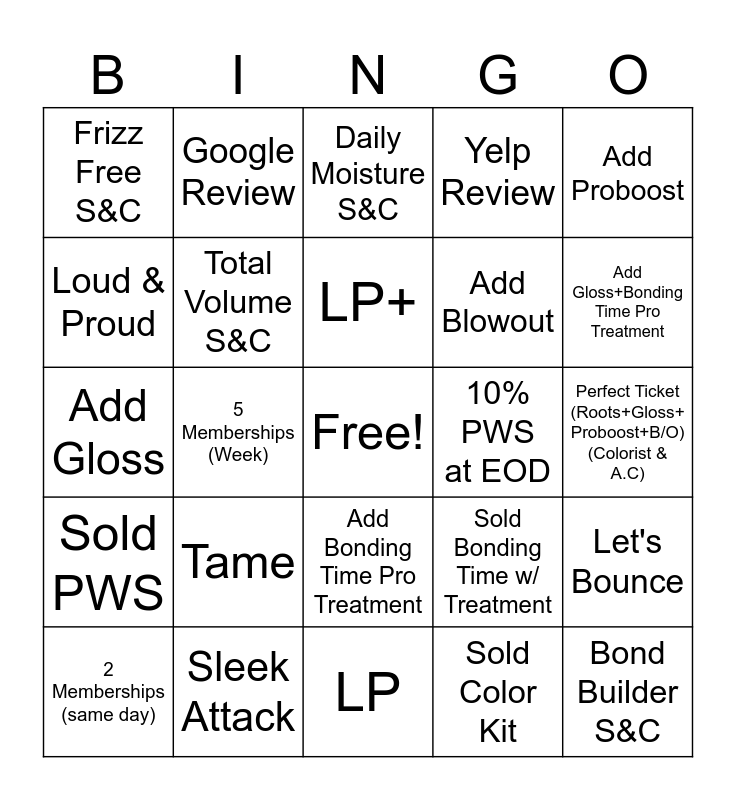 This bingo card has a free space and 24 words: Tame, Sleek Attack, LP+, 2 Memberships (same day), Add Proboost, Frizz Free S&C, Loud & Proud, Google Review, 10% PWS at EOD, Add Bonding Time Pro Treatment, Add Blowout, Add Gloss, Sold Bonding Time w/ Treatment, Let's Bounce, Total Volume S&C, Sold Color Kit, Perfect Ticket (Roots+Gloss+ Proboost+B/O) (Colorist & A.C), Daily Moisture S&C, Add Gloss+Bonding Time Pro Treatment, 5 Memberships (Week), Bond Builder S&C, Sold PWS, Yelp Review and LP.