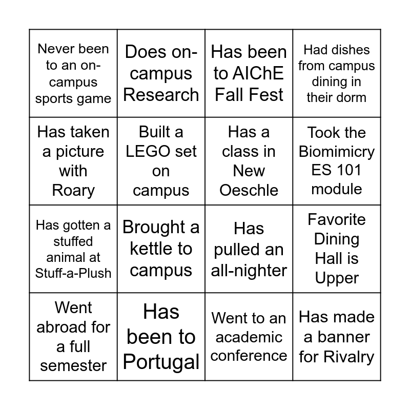 This bingo card has 32 words: Lives/Lived in Ruef, Is a first-year student, Favorite Dining Hall is Upper, Has played spikeball on the Quad, Has made a banner for Rivalry, Has a class in New Oeschle, Has taken a picture with Roary, Speaks more than one language, Does on-campus Research, Took Drug Delivery, Took the Biomimicry ES 101 module, Has been to AIChE Fall Fest, Has a record collection, Plays guitar, Has been to Portugal, Is a morning person, Has received a parking ticket, Has pulled an all-nighter, From New York, Had Professor Woo for a class, Never been to Mojo's, Interned with Air Products, Went to an academic conference, Can't drive, Went abroad for a full semester, Had dishes from campus dining in their dorm, Has gotten a stuffed animal at Stuff-a-Plush, Built a LEGO set on campus, Never been to an on-campus sports game, Joined another Engineering Club, Read a new book over the summer and Brought a kettle to campus.