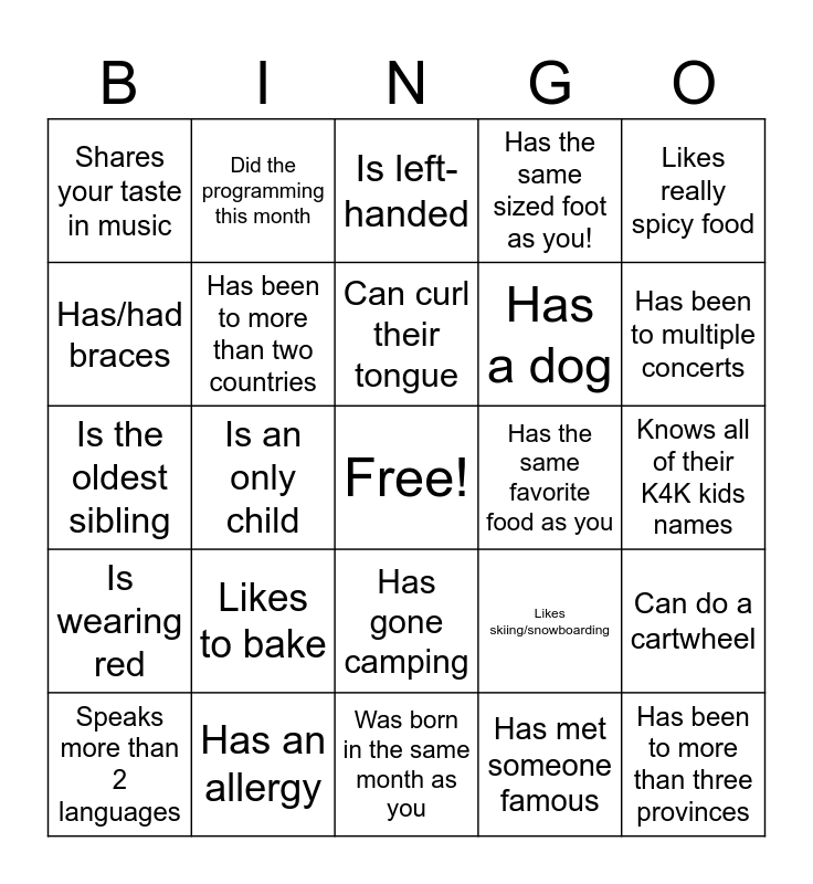 This bingo card has a free space and 29 words: Speaks more than 2 languages, Likes pineapple on pizza, Is an only child, Can play multiple instruments, Shares your taste in music, Is left-handed, Has been to more than two countries, Likes to bake, Has the same favorite food as you, Has an allergy, Knows all of their K4K kids names, Has been to more than three provinces, Was born in the same month as you, Has met someone famous, Has been to multiple concerts, Has been on a cruise, Has gone camping, Is wearing red, Likes really spicy food, Is the oldest sibling, Likes skiing/snowboarding, Has glasses, Has a dog, Has/had braces, Has the same sized foot as you!, Did the programming this month, Can do a cartwheel, Can curl their tongue and Has been in a parade.
