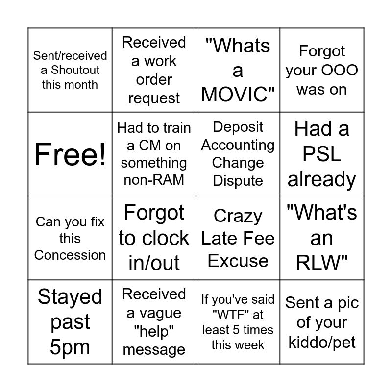 This bingo card has 16 words: Received a vague "help" message, "What's an RLW", "Whats a MOVIC", Sent/received a Shoutout this month, Can you fix this Concession, Received a work order request, Crazy Late Fee Excuse, If you've said "WTF" at least 5 times this week, Free!, Had to train a CM on something non-RAM, Stayed past 5pm, Forgot your OOO was on, Forgot to clock in/out, Had a PSL already, Deposit Accounting Change Dispute and Sent a pic of your kiddo/pet.
