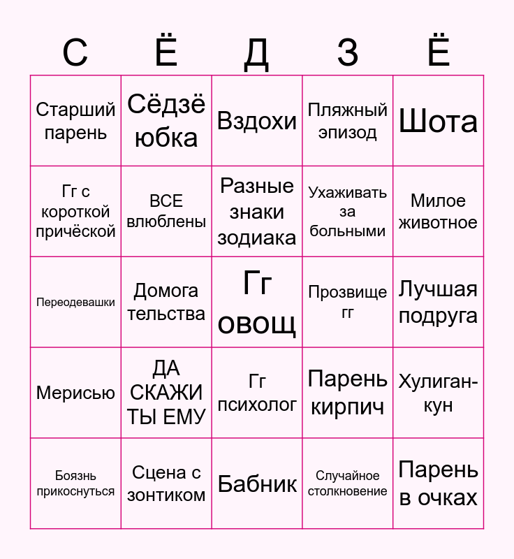 This bingo card has 39 words: Мужебаб, Хрупкая гг, Друг детства, ВСЕ влюблены, Боязнь прикоснуться, Гг психолог, Разные знаки зодиака, Кабедон, Шота, Мерисью, Домога тельства, Пляжный эпизод, Гг овощ, Лучшая подруга, Прозвище гг, ДА СКАЖИ ТЫ ЕМУ, Шиза, Старший парень, Гг без одного родителя, Парень кирпич, Гг с короткой причёской, Бабник, Ухаживать за больными, Милое животное, Радужные волосы, Неловкое падение, Парень в очках, Магия, Цундере, Сёдзё юбка, Двойняшки или близняшки, Парень с длинными волосами, Вздохи, Сцена с зонтиком, Случайное столкновение, Школьники, Хулиган-кун, Переодевашки and Что это за чувство.