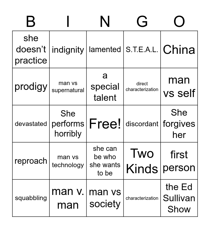 This bingo card has a free space and 28 words: first person, indirect characterization, direct characterization, characterization, prodigy, lamented, indignity, reproach, discordant, squabbling, devastated, S.T.E.A.L., man v. man, man vs society, man vs self, man vs nature, man vs technology, man vs supernatural, a special talent, she can be who she wants to be, she doesn’t practice, stubbornness, the Ed Sullivan Show, She performs horribly, She forgives her, Two Kinds, China and Chess.