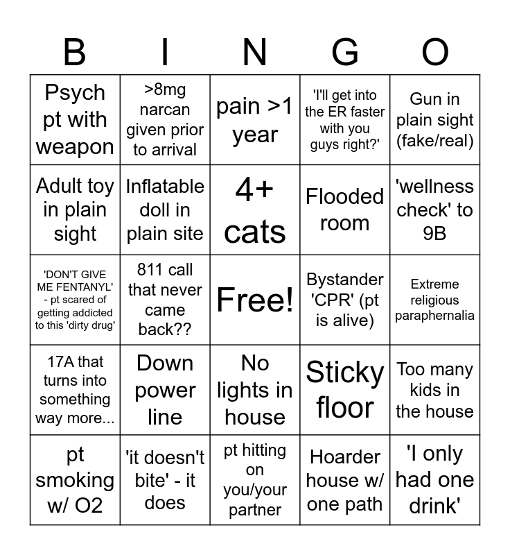 This bingo card has a free space and 24 words: Down power line, 'it doesn't bite' - it does, 4+ cats, pt smoking w/ O2, Gun in plain sight (fake/real), Psych pt with weapon, Adult toy in plain sight, >8mg narcan given prior to arrival, Bystander 'CPR' (pt is alive), No lights in house, Flooded room, 'DON'T GIVE ME FENTANYL' - pt scared of getting addicted to this 'dirty drug', Sticky floor, Too many kids in the house, Inflatable doll in plain site, Hoarder house w/ one path, Extreme religious paraphernalia, pain >1 year, 'wellness check' to 9B, 811 call that never came back??, 'I only had one drink', 17A that turns into something way more..., 'I'll get into the ER faster with you guys right?' and pt hitting on you/your partner.