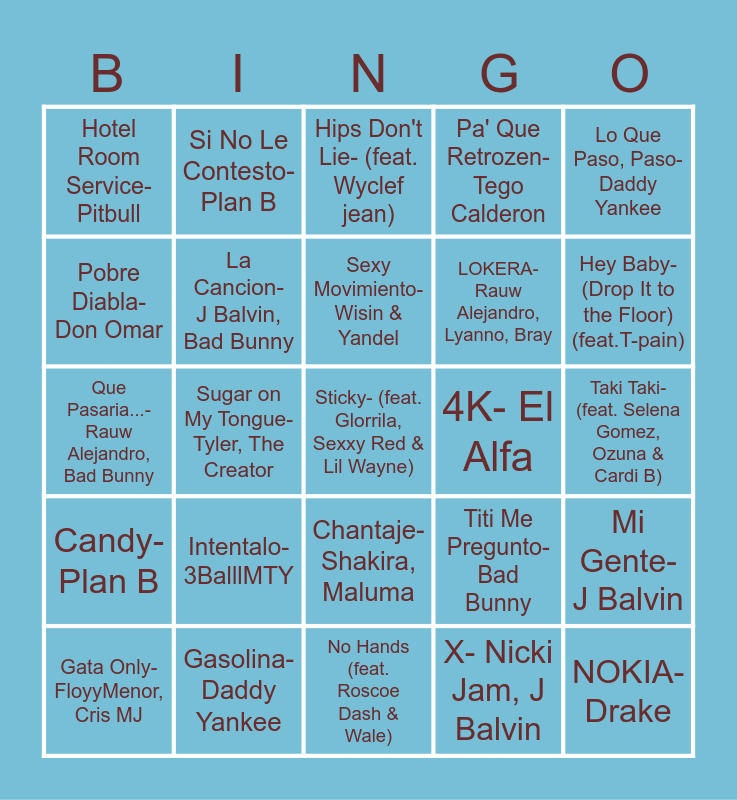 This bingo card has a free space and 24 words: Intentalo- 3BalllMTY, Gasolina- Daddy Yankee, Sexy Movimiento- Wisin & Yandel, Gata Only- FloyyMenor, Cris MJ, Lo Que Paso, Paso- Daddy Yankee, Hotel Room Service- Pitbull, Pobre Diabla- Don Omar, Si No Le Contesto- Plan B, 4K- El Alfa, Chantaje- Shakira, Maluma, LOKERA- Rauw Alejandro, Lyanno, Bray, Que Pasaria...- Rauw Alejandro, Bad Bunny, Titi Me Pregunto- Bad Bunny, Mi Gente- J Balvin, La Cancion- J Balvin, Bad Bunny, X- Nicki Jam, J Balvin, Taki Taki- (feat. Selena Gomez, Ozuna & Cardi B), Hips Don't Lie- (feat. Wyclef jean), Hey Baby- (Drop It to the Floor) (feat.T-pain), Sugar on My Tongue- Tyler, The Creator, NOKIA- Drake, Candy- Plan B, Pa' Que Retrozen- Tego Calderon and No Hands (feat. Roscoe Dash & Wale).