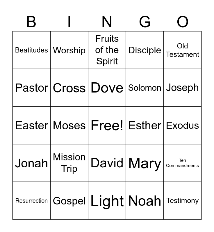 This bingo card has a free space and 70 words: Genesis, Exodus, Psalms, Proverbs, Gospel, Parable, Disciple, Apostles, Old Testament, New Testament, Ten Commandments, Sermon on the Mount, Beatitudes, Fruits of the Spirit, Armor of God, Moses, David, Solomon, Elijah, Jonah, Esther, Mary, Joseph, Paul, Peter, John the Baptist, Jesus, Judas, Noah, Abraham, Worship, Prayer, Tithes, Offering, Baptism, Communion, Choir, Fellowship, Youth Group, Pastor, Deacon, Mission Trip, Testimony, Sunday School, Bible Study, Cross, Resurrection, Salvation, Grace, Faith, Hope, Love, Mercy, Forgiveness, Light, Lamb, Dove, Crown, Rainbow, Bread of Life, Easter, Christmas, Pentecost, Good Friday, Hallelujah, Amen, Gospel Music, Revival, God is good and Fear not.