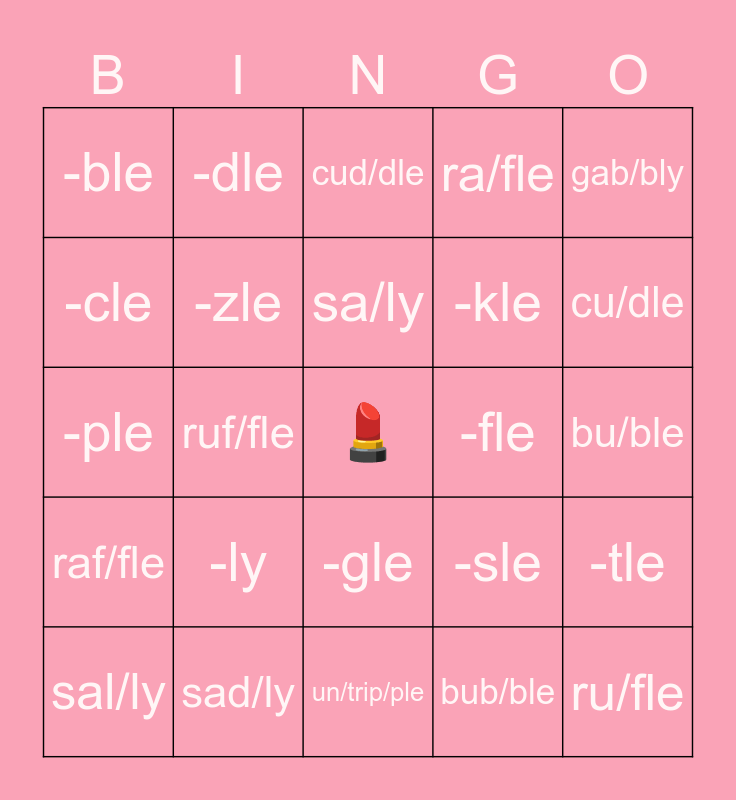 This bingo card has a free space and 24 words: -ly, sad/ly, sa/ly, sal/ly, gab/bly, -ble, -cle, -dle, -fle, -gle, -kle, -ple, -sle, -tle, -zle, bub/ble, bu/ble, cud/dle, cu/dle, ruf/fle, ru/fle, raf/fle, ra/fle and un/trip/ple.