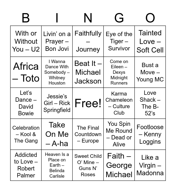 This bingo card has a free space and 50 words: Billie Jean – Michael Jackson, Like a Virgin – Madonna, Girls Just Want to Have Fun – Cyndi Lauper, Sweet Child O’ Mine – Guns N’ Roses, Take On Me – A-ha, Don’t Stop Believin’ – Journey, Livin’ on a Prayer – Bon Jovi, Wake Me Up Before You Go-Go – Wham!, Africa – Toto, Every Breath You Take – The Police, I Wanna Dance With Somebody – Whitney Houston, Eye of the Tiger – Survivor, Footloose – Kenny Loggins, You Spin Me Round – Dead or Alive, Pour Some Sugar on Me – Def Leppard, Material Girl – Madonna, Beat It – Michael Jackson, Karma Chameleon – Culture Club, Hungry Like the Wolf – Duran Duran, Tainted Love – Soft Cell, Jessie’s Girl – Rick Springfield, Faith – George Michael, With or Without You – U2, Come on Eileen – Dexys Midnight Runners, Walk Like an Egyptian – The Bangles, Push It – Salt-N-Pepa, Bust a Move – Young MC, Rock You Like a Hurricane – Scorpions, Faithfully – Journey, The Final Countdown – Europe, 99 Luftballons – Nena, Never Gonna Give You Up – Rick Astley, Under Pressure – Queen & David Bowie, Hit Me With Your Best Shot – Pat Benatar, Heaven Is a Place on Earth – Belinda Carlisle, Don’t You Forget About Me – Simple Minds, Another One Bites the Dust – Queen, Should I Stay or Should I Go – The Clash, Mickey – Toni Basil, Love Shack – The B-52’s, Jump – Van Halen, Relax – Frankie Goes to Hollywood, We Got the Beat – The Go-Go’s, She Drives Me Crazy – Fine Young Cannibals, Addicted to Love – Robert Palmer, Let’s Dance – David Bowie, Red Red Wine – UB40, Funkytown – Lipps Inc., Celebration – Kool & The Gang and She’s Like the Wind – Patrick Swayze.