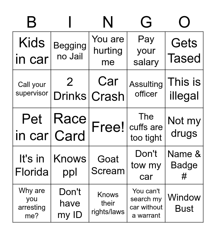 This bingo card has a free space and 24 words: Knows ppl, Don't have my ID, Car Crash, Why are you arresting me?, Gets Tased, Kids in car, Call your supervisor, Begging no Jail, The cuffs are too tight, Goat Scream, Assulting officer, Pet in car, Don't tow my car, Name & Badge #, 2 Drinks, You can't search my car without a warrant, Not my drugs, You are hurting me, This is illegal, Race Card, Window Bust, It's in Florida, Pay your salary and Knows their rights/laws.