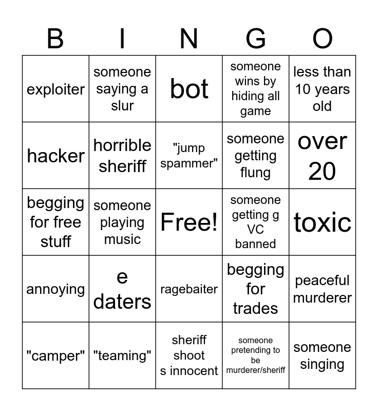 This bingo card has a free space and 24 words: e daters, "teaming", "jump spammer", "camper", less than 10 years old, exploiter, hacker, someone saying a slur, someone getting g VC banned, ragebaiter, someone getting flung, begging for free stuff, begging for trades, peaceful murderer, horrible sheriff, someone pretending to be murderer/sheriff, toxic, bot, over 20, someone playing music, someone singing, annoying, someone wins by hiding all game and sheriff shoot s innocent.