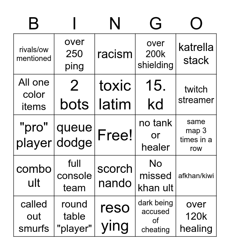 This bingo card has a free space and 34 words: katja being toxica, dark being accused of cheating, raven crashes out bout yag, cheater, combo ult, 2 bots, katrella stack, called out smurfs, over 250 ping, one of us dc, toxic latim, racism, 3 tanks, 3 healers, no tank or healer, twitch streamer, round table "player", "pro" player, full console team, No missed khan ult, scorch nando, only damage healer randoms, rivals/ow mentioned, same map 3 times in a row, reso ying, over 120k healing, over 200k shielding, over 150k damage, 15. kd, All one color items, max items, queue dodge, afkhan/kiwi and game drop.