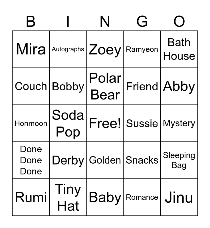 This bingo card has a free space and 29 words: Rumi, Purple, Soda Pop, Shoulders, Mira, Zoey, Bobby, Derby, Sussie, Tiny Hat, Mystery, Jinu, Baby, Romance, Abby, Tonic, Golden, Done Done Done, Bath House, Honmoon, Snacks, For the Fans, Friend, Couch, Ramyeon, Autographs, Sleeping Bag, Polar Bear and Yangari.