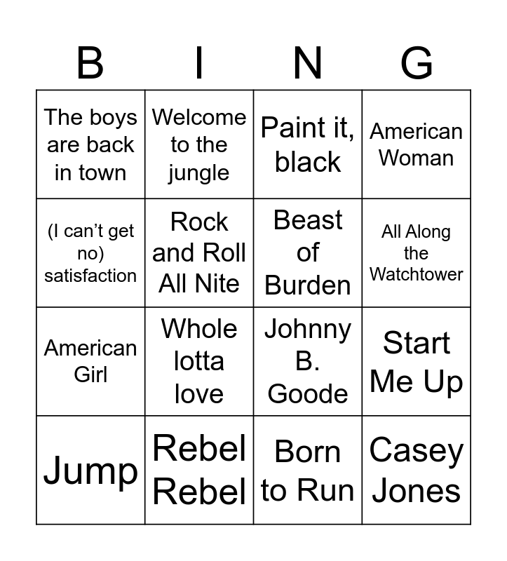 This bingo card has 20 words: Start Me Up, Africa, Paint it, black, 867-5309, Jump, (I can’t get no) satisfaction, Rebel Rebel, The boys are back in town, American Girl, Welcome to the jungle, Whole lotta love, Johnny B. Goode, Rock and Roll All Nite, Casey Jones, Beast of Burden, Purple Haze, All Along the Watchtower, American Woman, Born to Run and Black Dog.