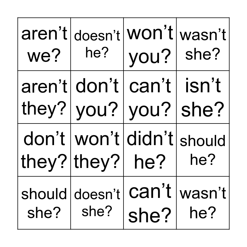 This bingo card has 25 words: Free!, isn’t he?, isn’t she?, isn’t it?, aren’t they?, aren’t we?, don’t you?, doesn’t he?, doesn’t she?, doesn’t it?, don’t they?, didn’t he?, didn’t she?, didn’t they?, can’t you?, can’t he?, can’t she?, won’t you?, won’t they?, should he?, should she?, shouldn’t they?, wasn’t he?, wasn’t she? and weren’t they?.