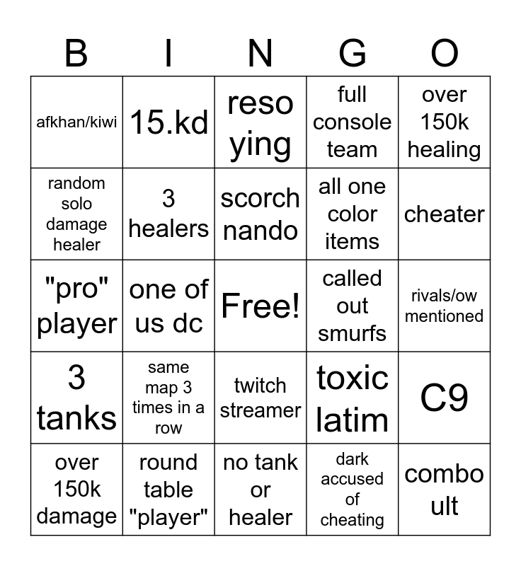 This bingo card has a free space and 34 words: katja being toxica, dark accused of cheating, raven crashes out over yag, katrella stack, 3 tanks, 3 healers, over 150k healing, over 150k damage, 15.kd, over 250 ping, scorch nando, reso ying, over 200k healing, no missed khan ult, called out smurfs, cheater, round table "player", "pro" player, same map 3 times in a row, toxic latim, twitch streamer, racism, afkhan/kiwi, rivals/ow mentioned, no tank or healer, combo ult, full console team, queue dodge, all one color items, random solo damage healer, 2 bots, one of us dc, C9 and someone says "noob"/"bot".