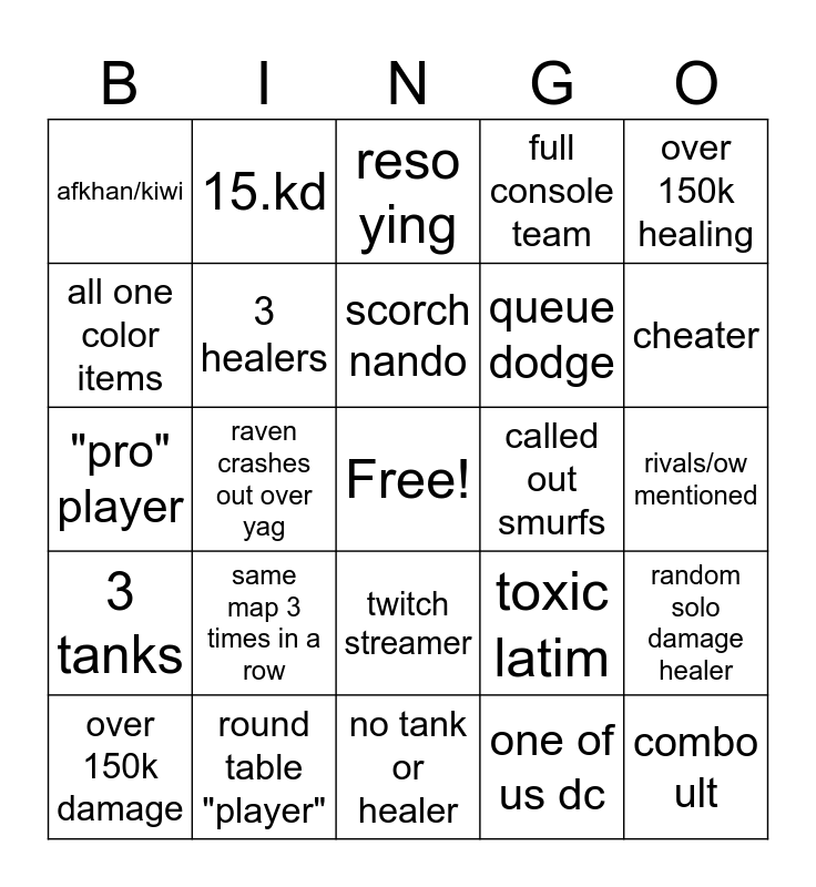 This bingo card has a free space and 33 words: katja being toxica, dark accused of cheating, raven crashes out over yag, katrella stack, 3 tanks, 3 healers, over 150k healing, over 150k damage, 15.kd, over 250 ping, scorch nando, reso ying, over 200k healing, no missed khan ult, called out smurfs, cheater, round table "player", "pro" player, same map 3 times in a row, toxic latim, twitch streamer, racism, afkhan/kiwi, rivals/ow mentioned, no tank or healer, combo ult, full console team, queue dodge, all one color items, random solo damage healer, 2 bots, one of us dc and someone says "noob"/"bot".
