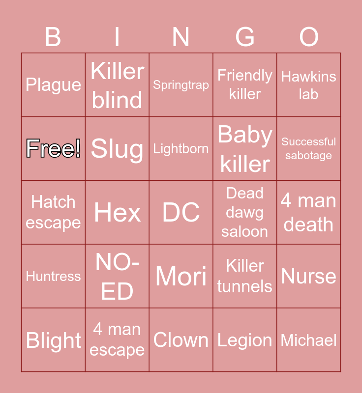 This bingo card has a free space and 24 words: NO-ED, 4 man escape, Lightborn, Blight, Hawkins lab, Plague, Free!, Killer blind, Dead dawg saloon, Mori, Baby killer, Hatch escape, Killer tunnels, Nurse, Slug, Legion, 4 man death, Springtrap, Successful sabotage, Hex, Michael, Huntress, Friendly killer and Clown.