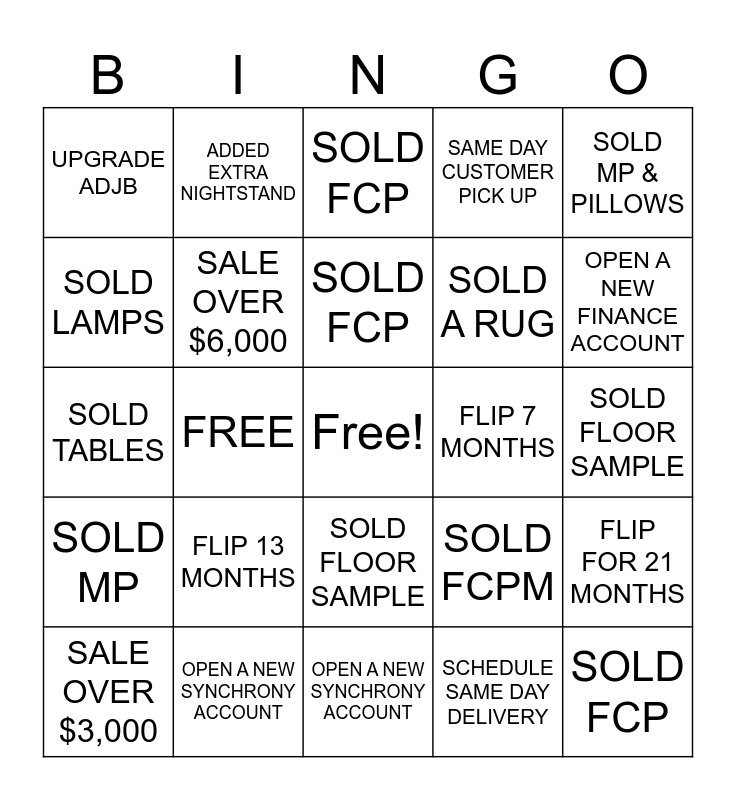 This bingo card has a free space and 24 words: FLIP 13 MONTHS, OPEN A NEW SYNCHRONY ACCOUNT, SOLD FCP, SALE OVER $3,000, SOLD MP & PILLOWS, UPGRADE ADJB, SOLD LAMPS, ADDED EXTRA NIGHTSTAND, FLIP 7 MONTHS, SOLD FLOOR SAMPLE, SOLD A RUG, SOLD TABLES, SOLD FCPM, FLIP FOR 21 MONTHS, SALE OVER $6,000, SCHEDULE SAME DAY DELIVERY, SOLD FLOOR SAMPLE, SOLD FCP, OPEN A NEW FINANCE ACCOUNT, FREE, SOLD FCP, SOLD MP, SAME DAY CUSTOMER PICK UP and OPEN A NEW SYNCHRONY ACCOUNT.