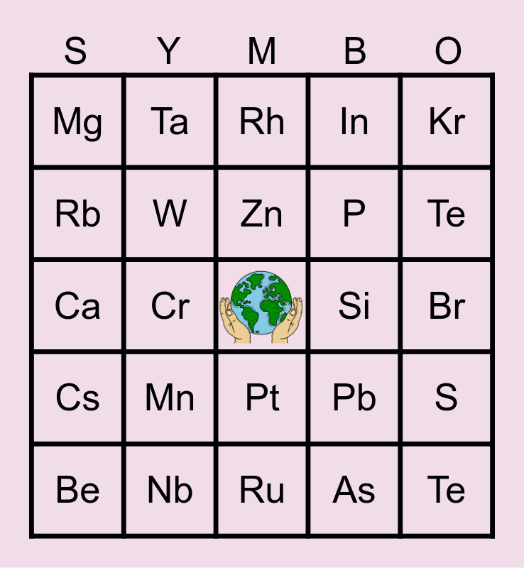This bingo card has a free space and 24 words: Be, Mn, Zn, As, Kr, Mg, Ta, Rh, Si, Br, Ca, W, Pb, S, Rb, Nb, Ru, In, Te, Cs, Cr, Pt, P and Te.